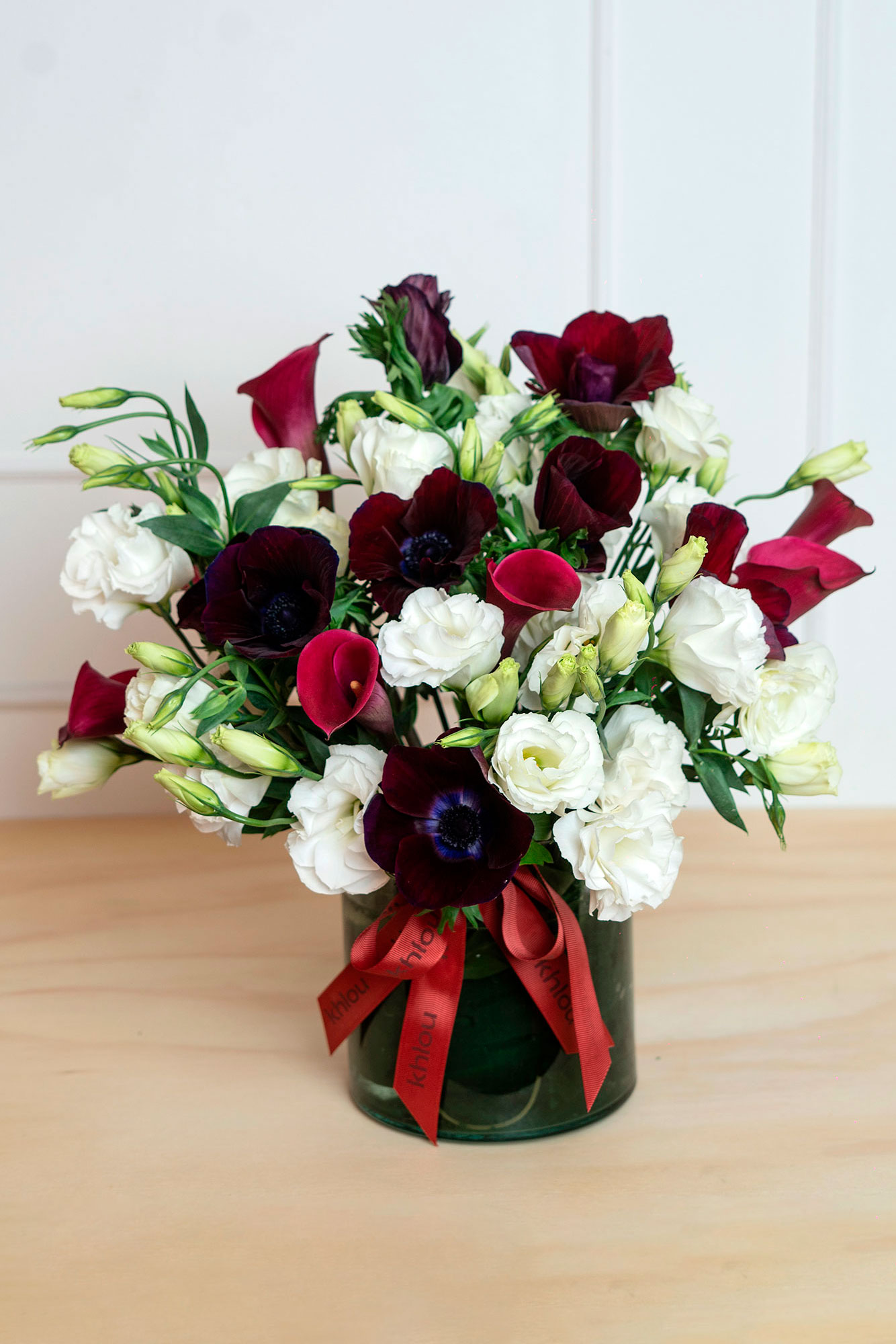Anémonas en color vino, callas en color burdeo y Lisianthus en color blanco en contenedor de vidrio transparente o cerámica negra.