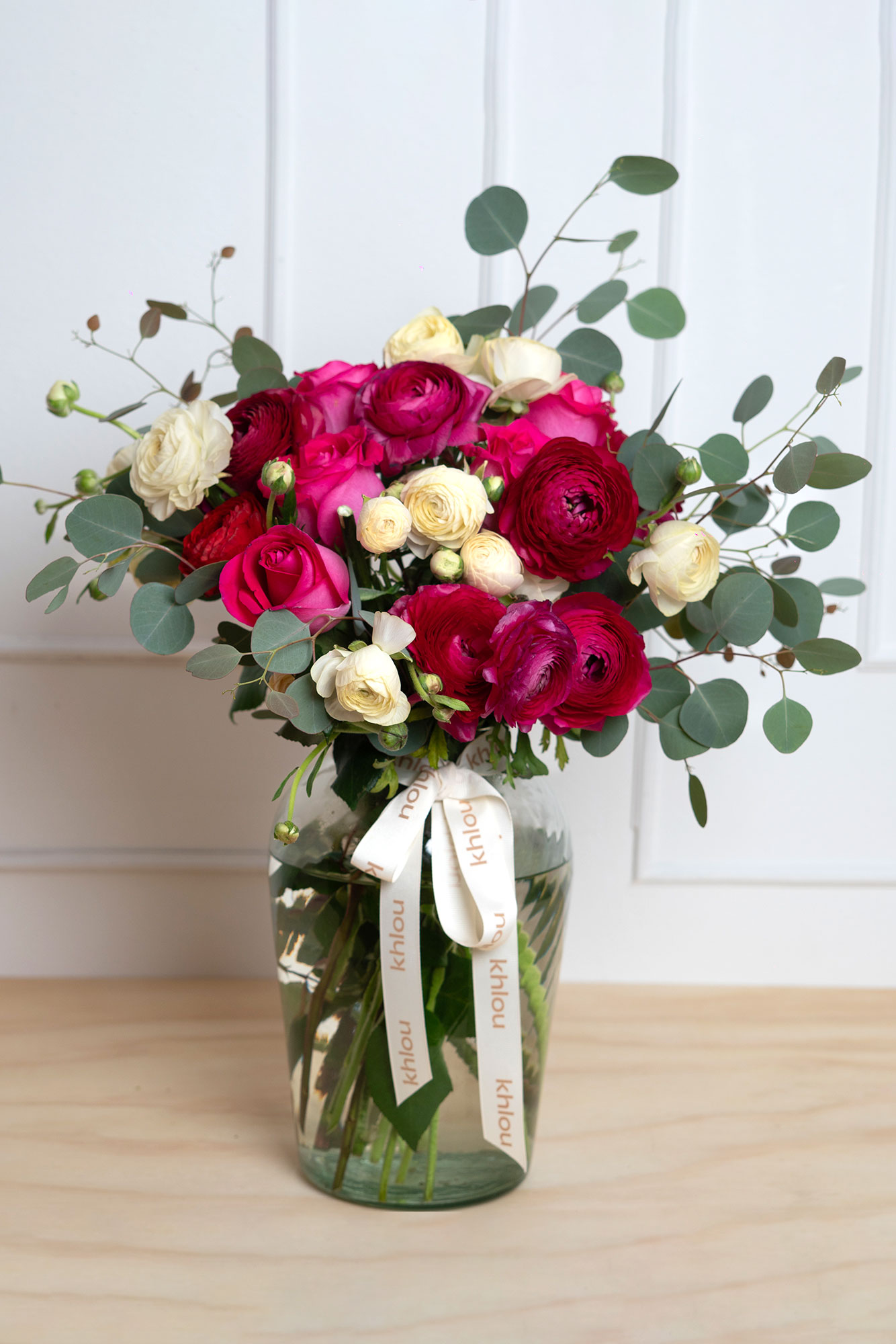 Rosas en color fucsia, Ranunculus rojo, Ranunculus blanco, en jarrón de vidrio transparente.